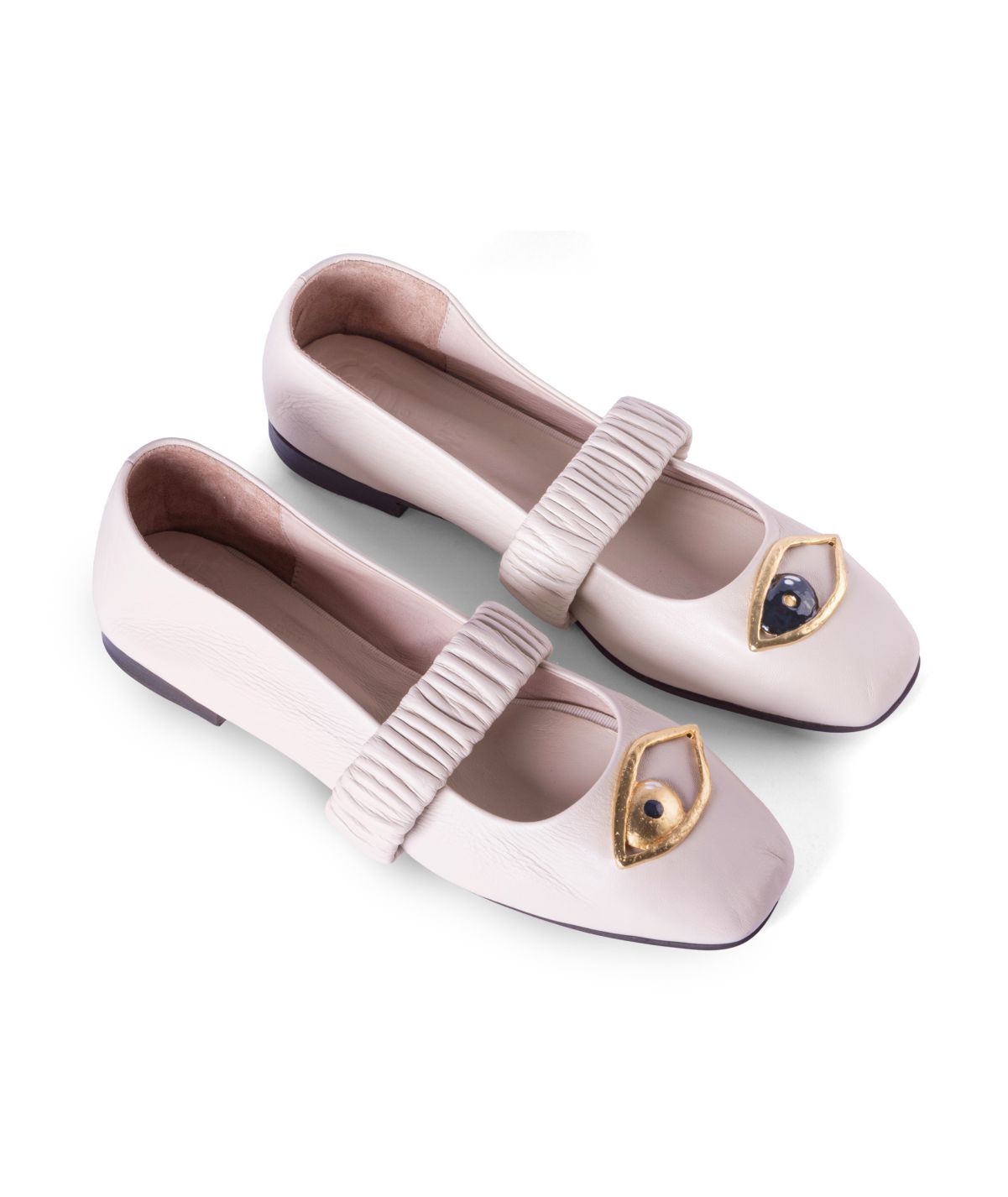 Inspirada en el desestructuracionismo de Carlos Polite, esta bailarina rompe con lo tradicional al combinar una silueta clásica y cómoda con detalles inesperados: un elástico plisado que aporta textura y modernidad, y un aplique joya en forma de ojo dorado diseñado por Sara&Flora, símbolo de fuerza y sofisticación.